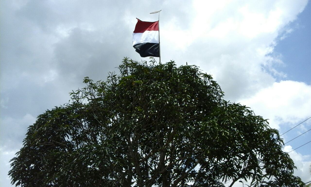 Bendera tiga warna itu, Merah, Putih dan Hitam dikibarkan diatas pepohonan Selasa 28/02/2017. dengan memakai bambu yang menjulur ke atas, tepatnya di depan Rumah Maspur (50) Warga Dusun Platokan, Desa Prancak Kecamatan Pasongsongan.