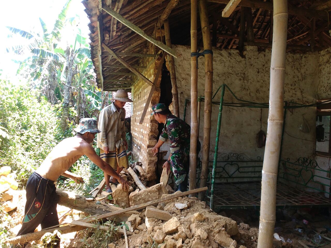 Transmadura com, Sumenep – Bintara Pembina Desa (Babinsa) Kalebengan, Koramil 0827/13 Rubaru Kodim 0827 Sumenep Serka Ahmad Kusfandi, melaksanakan karya bakti atau gotong royong dalam membantu memperbaiki rumah milik bapak Sernuji salah satu warga masyarakat di Dusun Kalebengan Daya, Desa Kalebengan Kecamatan Rubaru, Kabupaten Sumenep. Kamis (6/7/2017) siang