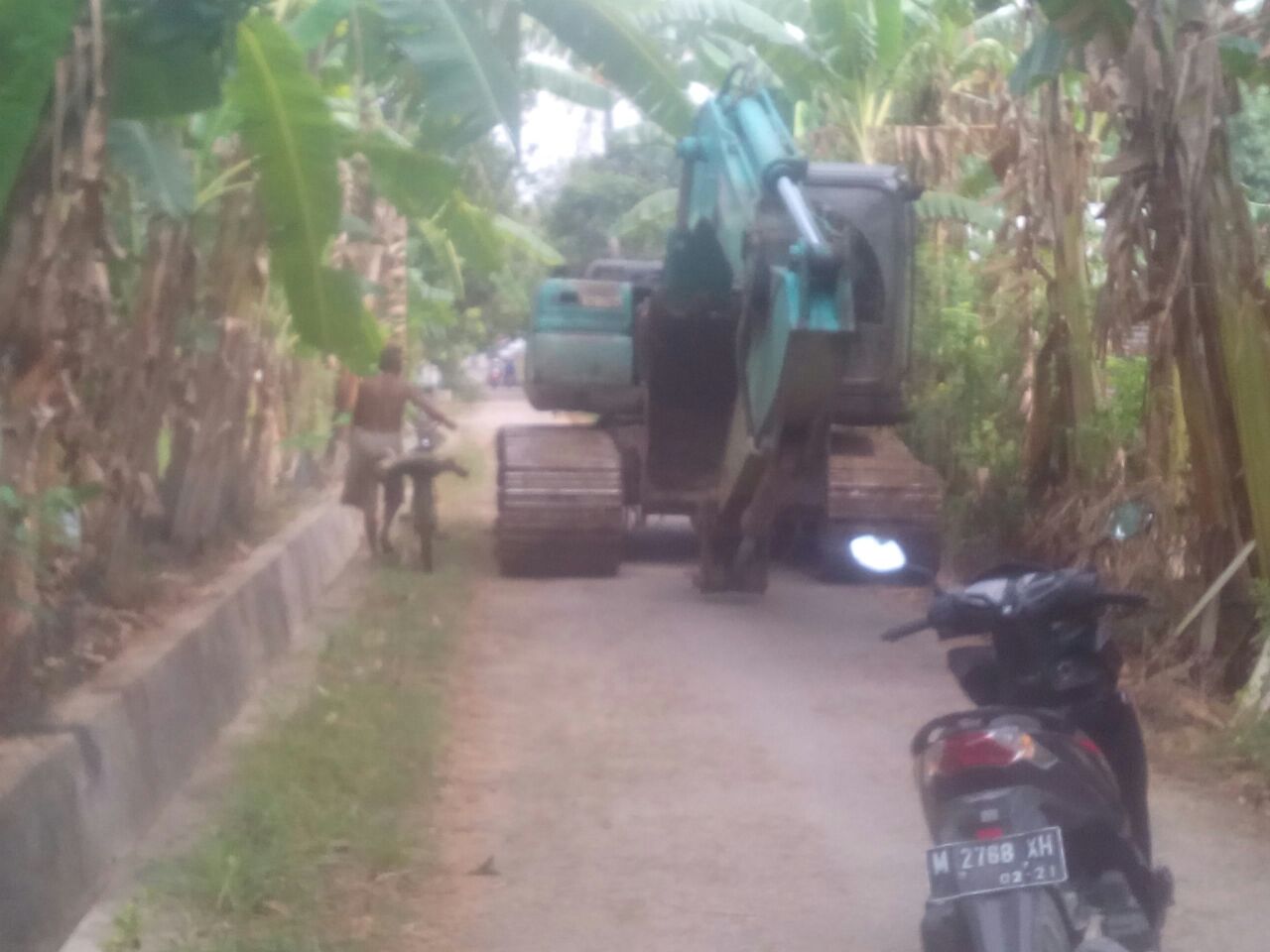 Jalan yang rusak akibat dilindas toda excavator tidak diperbaiki.