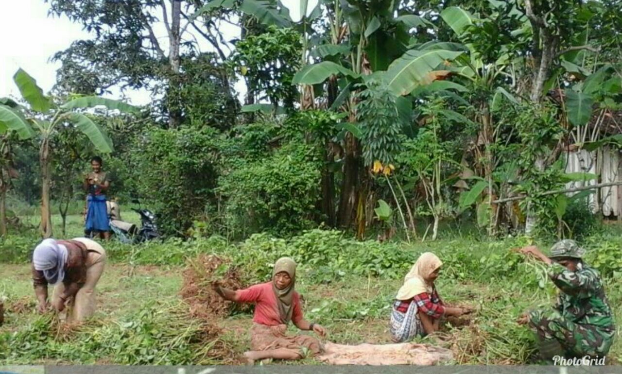 Anggota Koramil 0827/13 Rubaru, Serda Dominggus Babinsa Desa Bunbarat melaksanakan kegiatan membantu panen kacang tanah bersama warga setempat bertempat di lahan tegal milik Ibu Hamidah (54 thn) Desa Bunbarat, Kecamatan Rubaru, Kabupaten Sumenep-Madura, Jawa Timur.