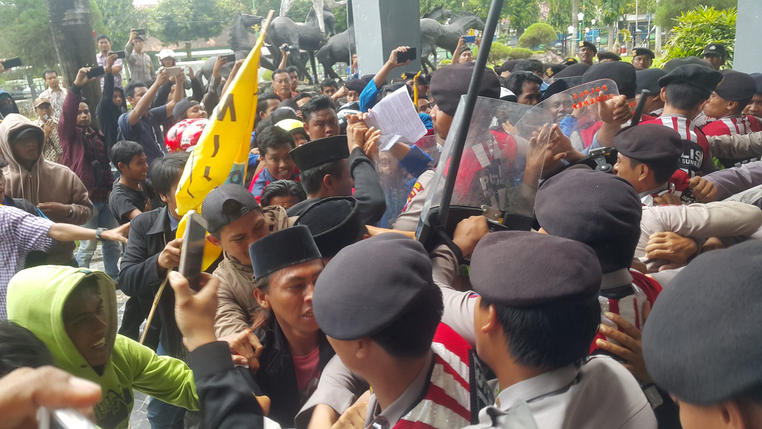 Pantauan media ini, demontran memaksa masuk ke dalam kantor gedung DPRD, dan dipicu dengan memaksanya sejumlah demonstran masuk, bentrok massa aksi terjadi dengan aparat kepolisian bersenjata.