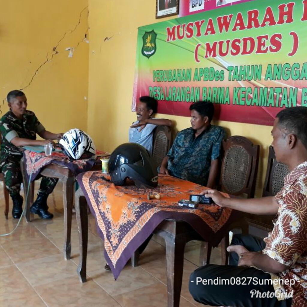 SUMENEP, (TransMadura.com) – Guna membangun warga masyarakat Kecamatan Batuputih Kabupaten Sumenep yang berkarakter dan berlandaskan Wawasan Kebangsaan dalam rangka mewujudkan Persatuan dan Kesatuan diwilayah Desa binaan, Serka Sumarwi anggota Koramil 15/Batuputih Kodim 0827 Sumenep melaksanakan Komunikasi Sosial (Komsos) dengan Aparatur Pemerintahan (Apem) Desa Dibalai Desa Larangan Barma Kecamatan Batuputih Kabupaten Sumenep. Madura-Jawa Timur. Senin, (5/3/2018).