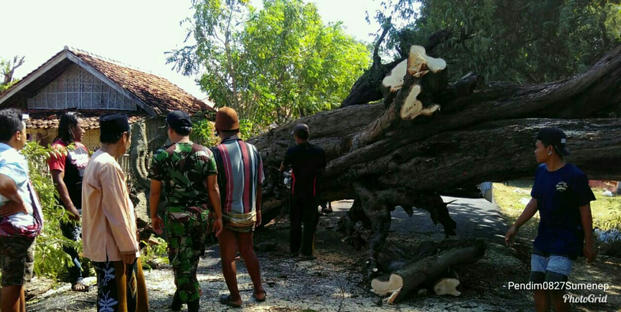 SUMENEP, (TransMadura.com) – Terjadinya Pergantian musim yang tidak bisa kita prediksi diakhiri-akhir ini dari musim hujan ke kemarau sering kali membuat cuaca tidak menentu, demikian juga yang terjadi diwilayah Kecamatan Ra’as pada siang hari ini dengan adaya hembusan angin kencang mengakibatkan pohon asem tumbang.