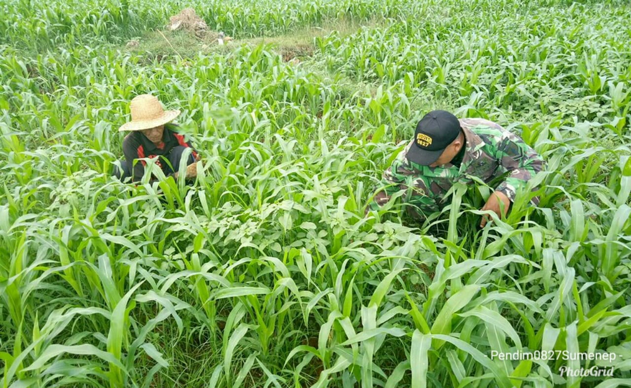 Bintara Pembina Desa (Babinsa) Koramil 15/Batuputih jajaran Kodim 0827/Sumenep turun langsung ke ladang yang ditanami jagung guna membantu membersihkan lahan dari rumah liar. Jagung yang ditanam di lahan milik Pak Asmawi tersebut merupakan jenis varietas bisi dua.