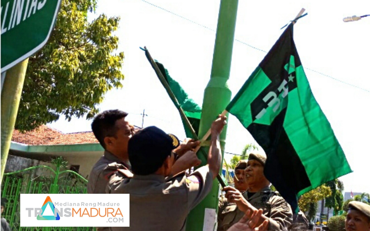 Satuan Polisi Pamong Praja (Satpol-PP) Kabupaten Sumenep, Madura, Jawa Timur, setelah melakukan penurunan bendera HMI di zona merah jalan trunojoyo akhirnya memasang kembali.