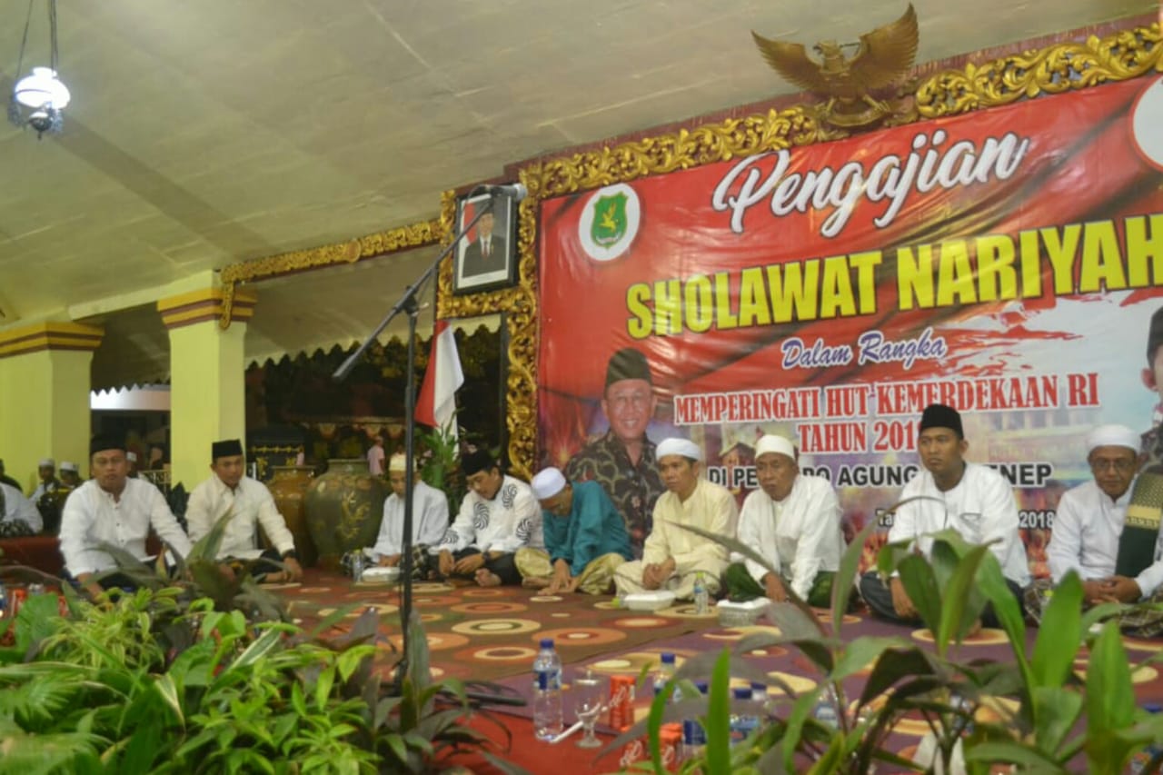 SUMENEP, (TRANSMADURA.COM) – Pengajian dan pembacaan shalawat nariyah dalam rangka memperingati HUT Kemerdekaan RI Ke – 73 pada tahun 2018 digelar bertempatan di Pendopo Agung Sumenep Jln. Dr. Soetomo Kelurahan Pajagalan Kecamatan Kota Kabupaten Sumenep. Madura-Jawa Timur. Minggu, (19/8/2018).