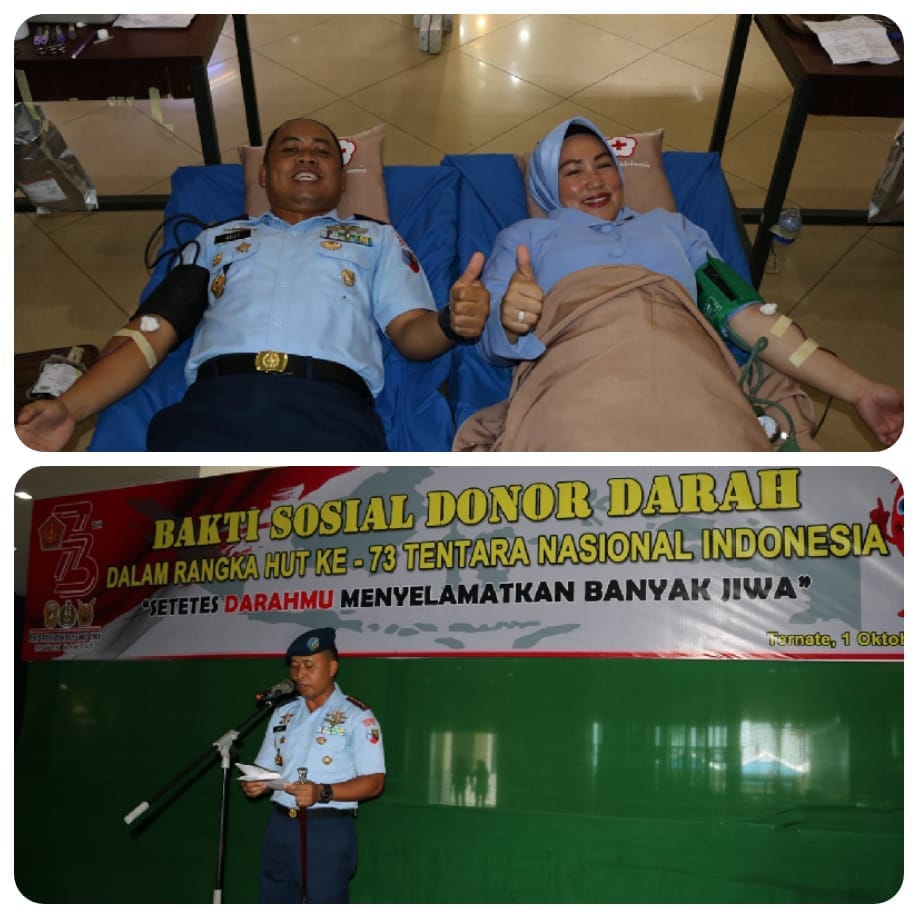 TERNATE, (TransMadura.com) – Dalam rangka Peringatan HUT TNI ke 73 Tahun 2018, Komandan Lanud Leo Wattimena Kolonel Nav Arif Budhiyanto, S. E., dan Ketua PIA Ardhya Garini Cabang 8/Daerah III Lanud Leo Wattimena, Ibu Sekarwati Natalia Arif, menghadiri kegiatan Donor Darah yang di adakan dilantai dasar Jatiland Mall Kawasan Reklamasi, Kelurahan Gamalama, Ternate Tengah.