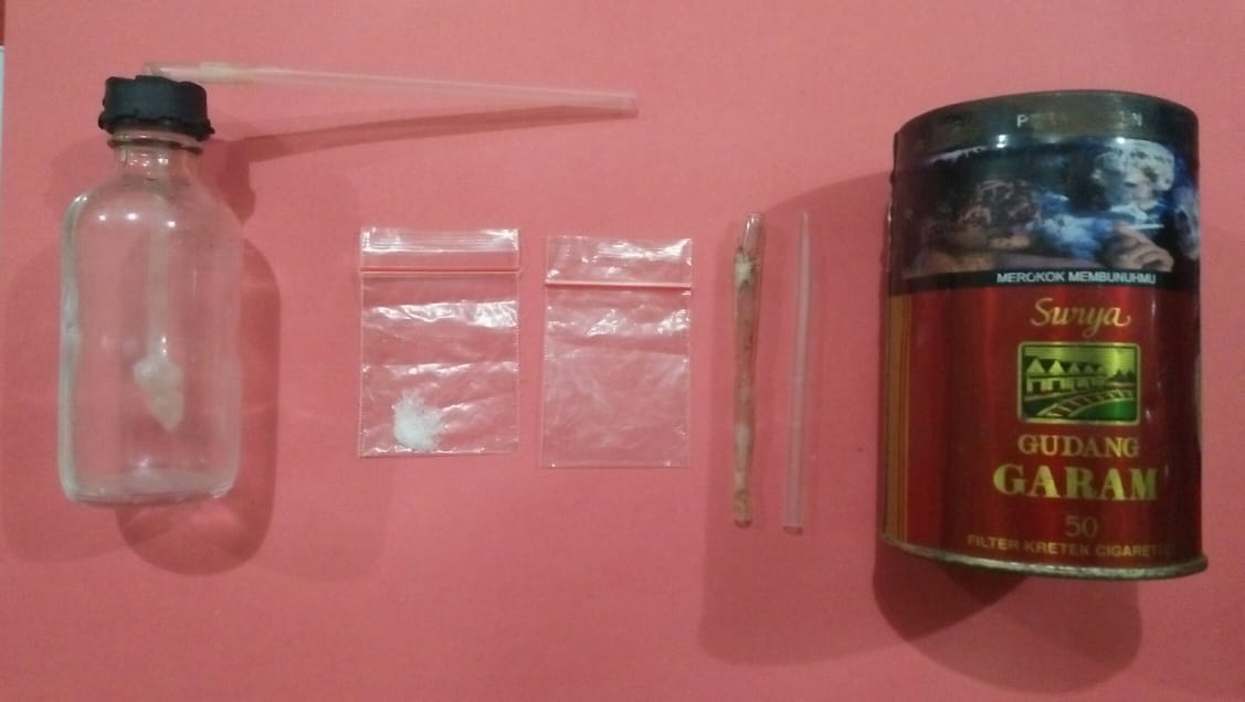 Seperangkat alat hisap berupa bong terbuat dari botol kaca yang pada tutupnya terdapat dua lubang masing-masing tersambung sedotan warna bening. 1 (satu) poket/kantong plastik klip kecil sisa pemakaian sabu. 1 (satu) buah kaleng dari seng bertuliskan Surya Gudang garam tempat menyimpan sabu.