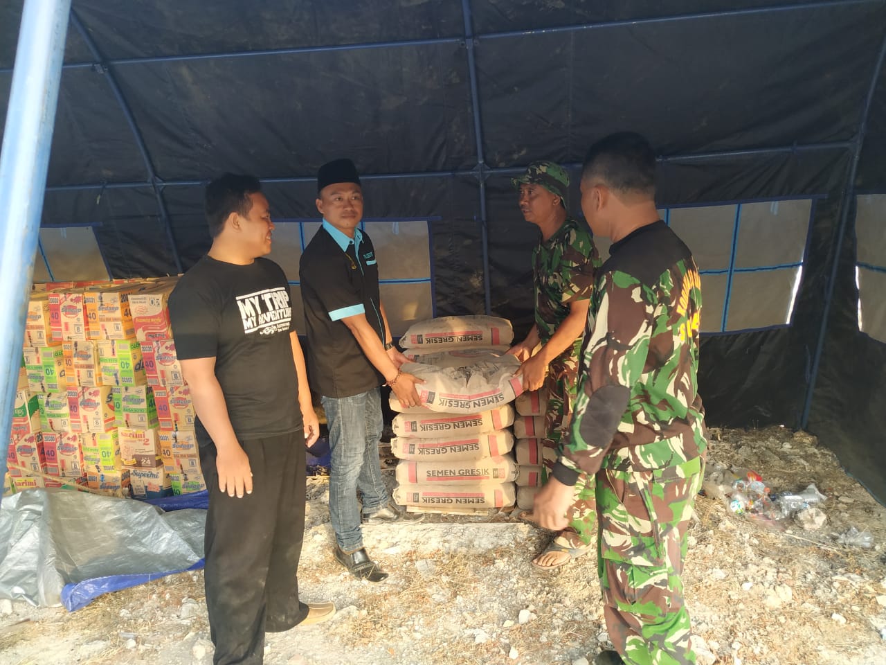 Jaringan Santri Pelajar Nusantara (JASPENO) serahkan Bantuan puluhan semen, Minggu (14/10/2018) kepada korban Gempa Bumi Pulau Sapudi, Sumenep, berkekuatan 6,4 SR yang terjadi pada pekan lalu.