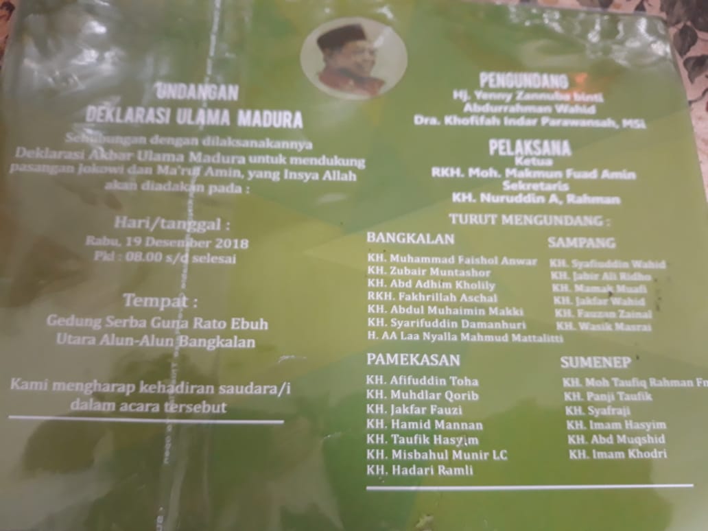 SUMENEP (TransMadura.com) -Panitia Deklarasi Ulama se-Madura Dukung Pasangan Calon Presiden dan Wakil Presiden Jokowi-KH. Ma’ruf Amin, pada Rabu, 19 Desember 2018, di Gedung Serba Guna Rato Ebuh, Bangkalan, mengaku telah menyebar sebanyak 50 ribu undangan untuk ulama Se-Madura.