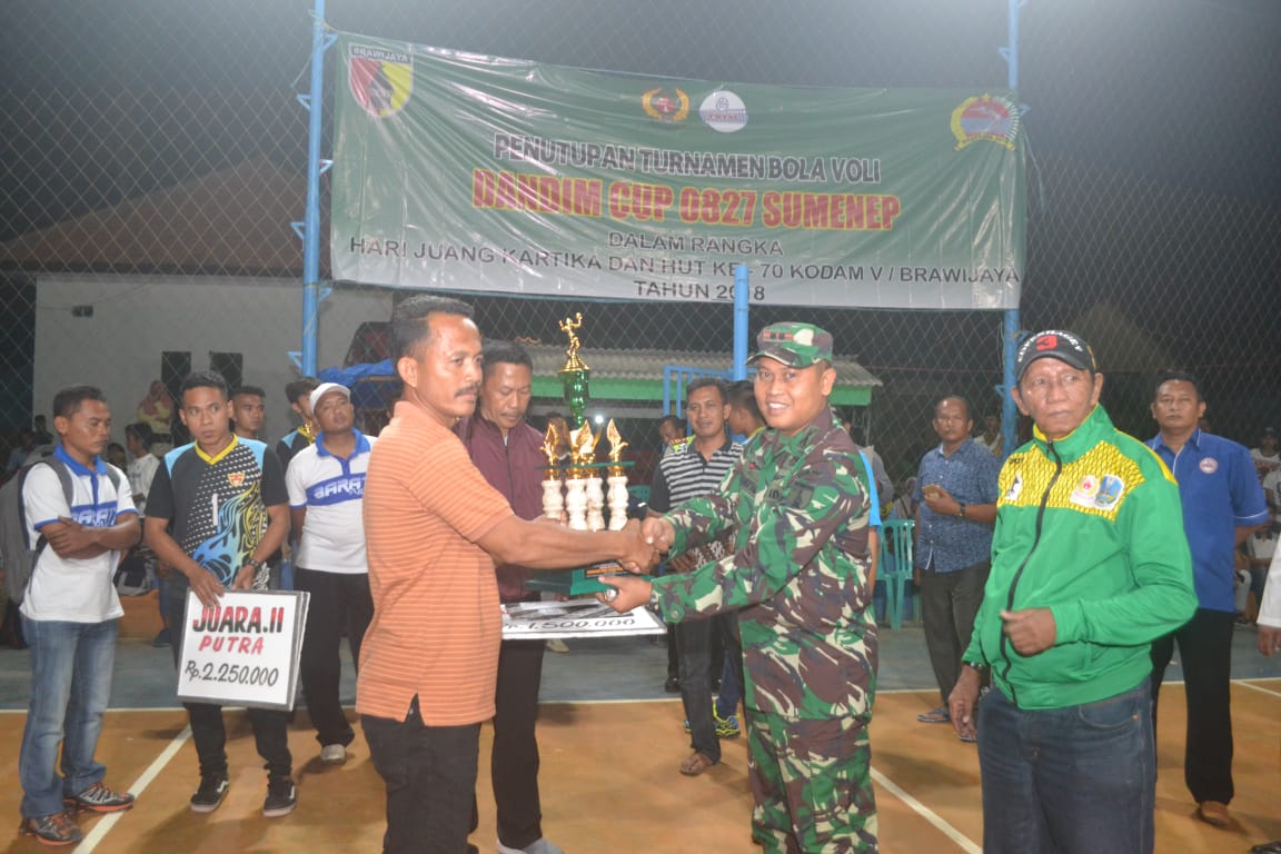 SUMENEP, (TransMadura.com) – Final dan penutupan Turnamen Bola Volly Dandim Cup 2018 dalam rangka Hari Juang Kartika dan HUT Kodam V/Brawijaya ke- 70, tergelar di lapangan Volly Bharata Agung bertempat di Dusun Cempaka Desa Campaka Kecamatan Pasongsongan Kabupaten Sumenep. Madura-Jawa Timur.