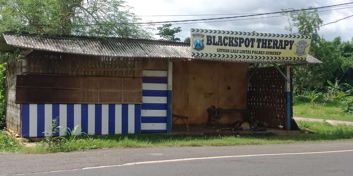 Tampak dari depan, pos tersebut tertulis bernama Blackspot Therapy Satuan Lalu Lintas Polres Sumenep, dengan kombinasi warna antara warna biru dan putih.