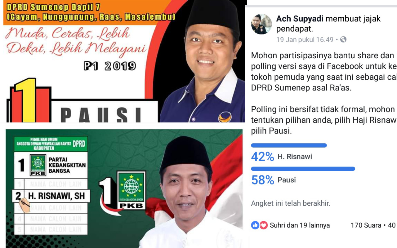Calon Legislatif (Caleg) DPRD, Sumenep, Daerah Pemilihan (dapil) 7 kepulauan menjadi perhatian publik setelah salah satu akun membuat polling Facebook terhadap dua Caleg asal Kepulauan Ra’as, bernama H Risnawi dan Pausi.
