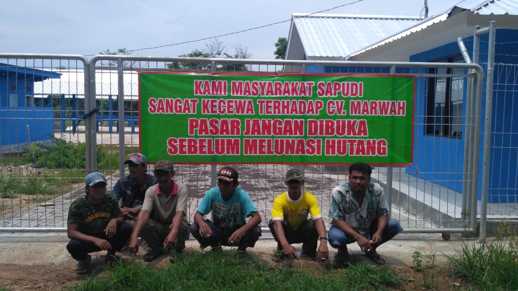 Warga melakukan aksi dengan memampangkan Banner dipasar bertuliskan “Kami Masyarakat Sapudi Kecewa Terhadap CV Marwah , Pasar Jangan Dibuka Sebelum Melunasi Hutang”.