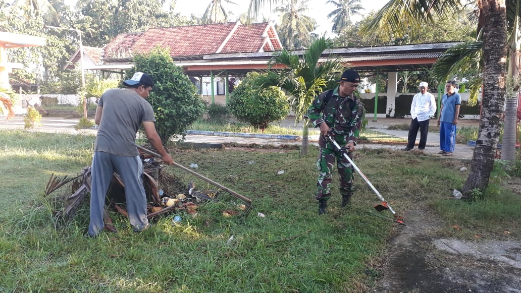 Babinsa Koramil 0827/18 Kangean Sertu Eko P, melakukan Karya Bhakti bersama sejumlah warga Dusun Masjid, Desa Laok Jang Jang, Kecamatan Arjasa, Sumenep, Madura, Jawa Timur, dengan membersihkan rumput dan selokan. Minggu, (24/2/2019).