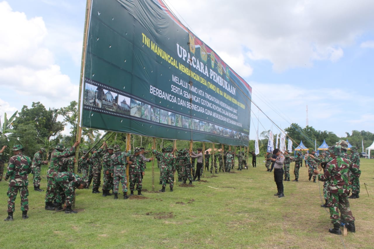 Pantauan media ini di lokasi, seperti yang tertulis pada Banner TMMD ke 1044, Kodim 0827 Sumenep mengambil tema “Melalui TMMD kita tingkatkan kebersamaan umat serta semangat gotong royong dalam kehidupan berbangsa dan bernegara guna mewujudkan ketahanan nasional”.
