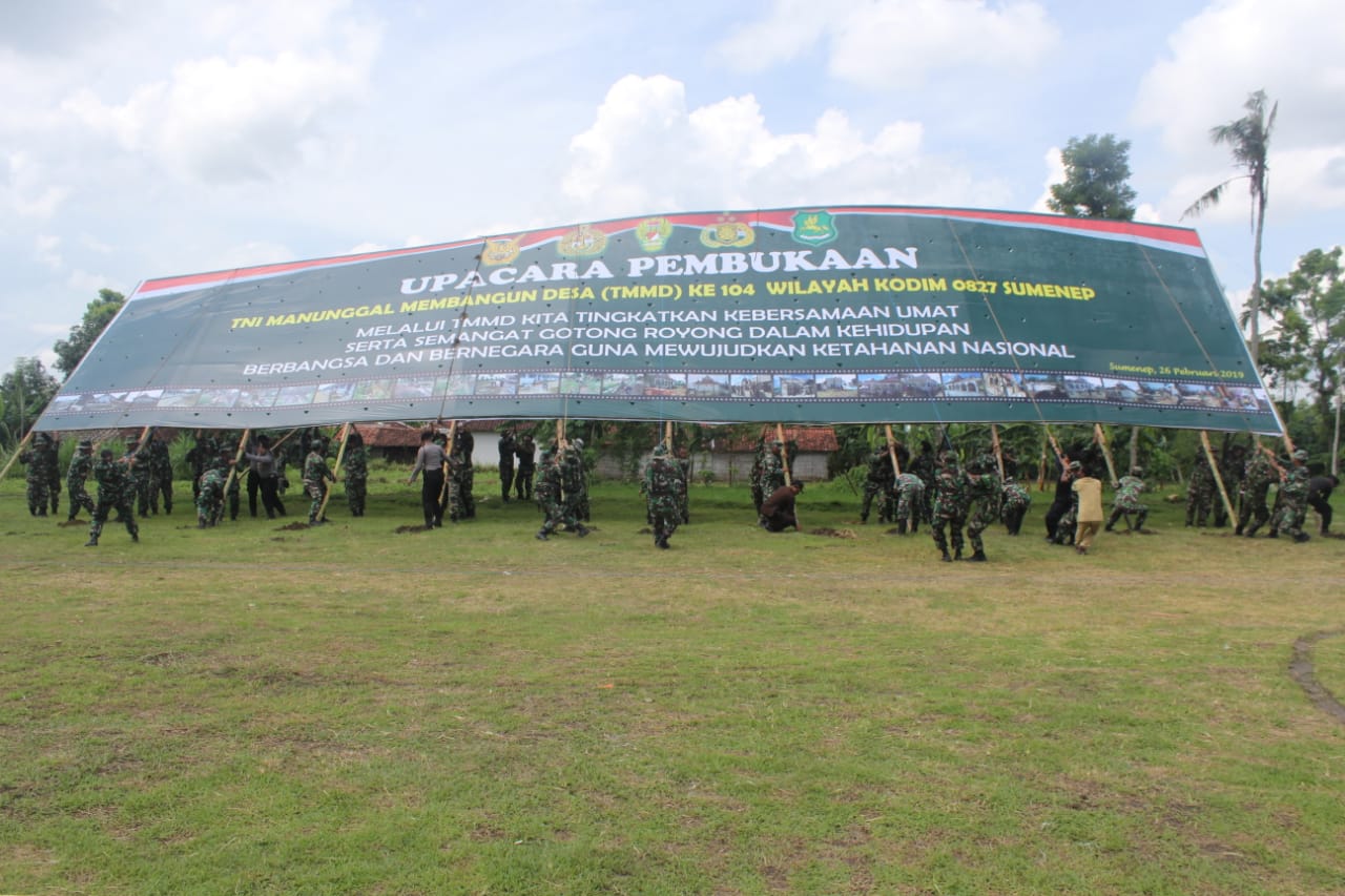 Pelaksanaan TMMD ke-104 Kodim 0827 Sumenep mengambil tema “Melalui TMMD kita tingkatkan kebersamaan umat serta semangat gotong royong dalam kehidupan berbangsa dan bernegara guna mewujudkan ketahanan nasional”.