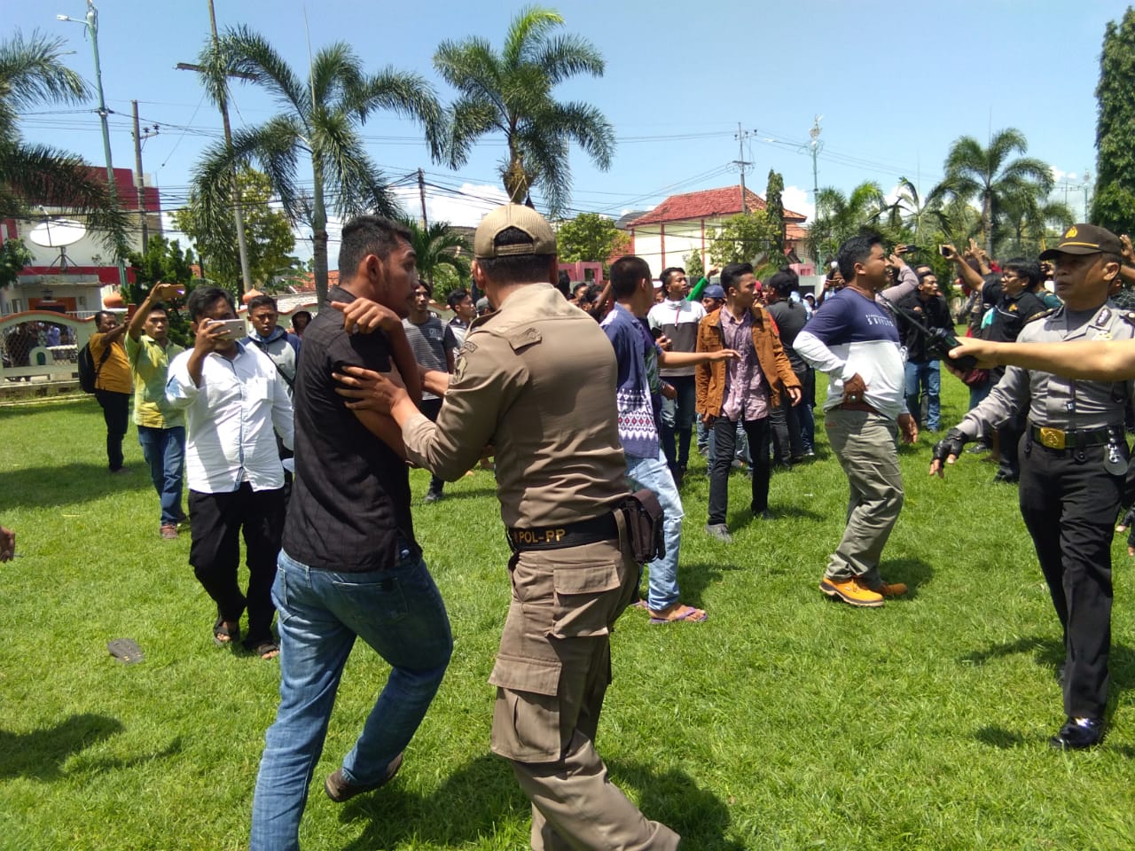 Saat aksi berlangsung, tiba tiba terjadi kericuhan bentrok para aksi dengan Sarpol-PP. Bahkan, sampai terjadi pemukulan terhadap para demonstran yanh dilakukan oknum satpol PP hingga mengalami luka robek pada bibir para aksi.