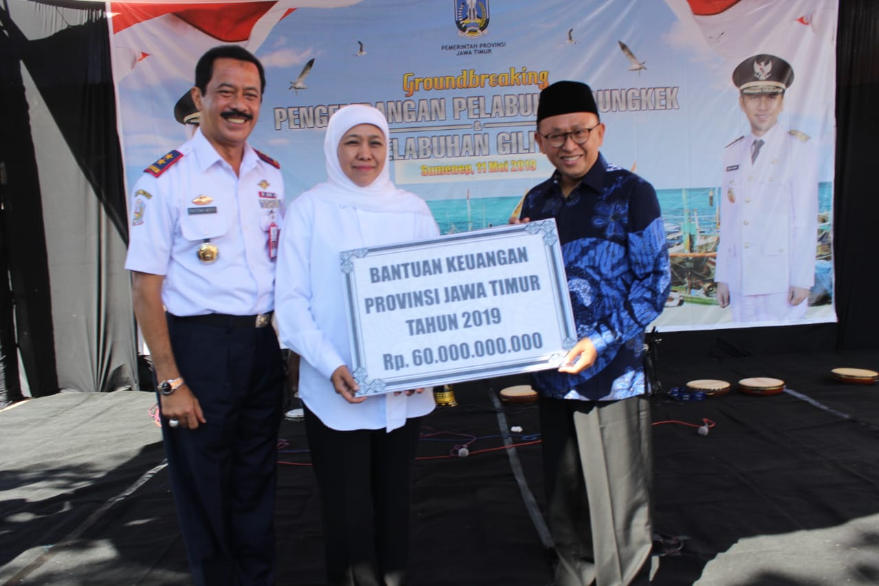 Gubernur Jawa Timur, Khofifah Indar Parawansa, M. Si, beserta rombongan mengadiri acara, dalam rangka “Ground Breaking” Pengembangan Pelabuhan Dungkek dan Pelabuhan Gili Iyang, Kecamatan Dungkek, Sumenep, Madura, Sabtu (11/5/2019).
