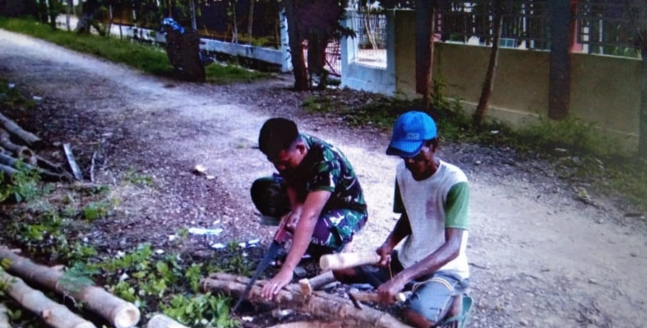 Serda A Muh Irfan melaksanakan Komsos dengan warga Desa Galis Bapak Rusli yang saat itu sedang memotong bambu buat pagar rumah.