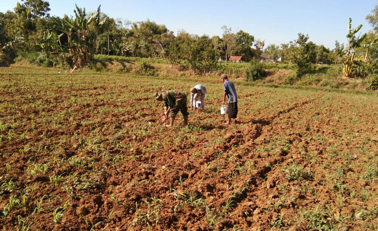 SUMENEP, (TransMadura.com) -Babinsa Koramil 0827/10 Ambunten Sertu Yuli Prasetyo melaksanakan kegiatan pendampingan pertanian membantu memupuk tanaman jagung di ladang Bapak Asmoni Dusun Kolpoh Desa Campor Barat Kecamatan Ambunten, Kabupaten Sumenep, Minggu (18/8/2019).