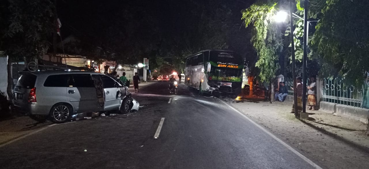 Kecelakaan lalu lintas Mobil Toyota Innova No Pol. L 1859 TX dengan Bus Pariwisata Nusantara Trans dengan Nomor Polisi B 7216 UGA di Jalan Nasional, Desa Pragaan Laok, Kecanatan Pragaan, Kabupaten Sumenep. Senin, (19/8/2019). sekira pukul 01:00 wib.