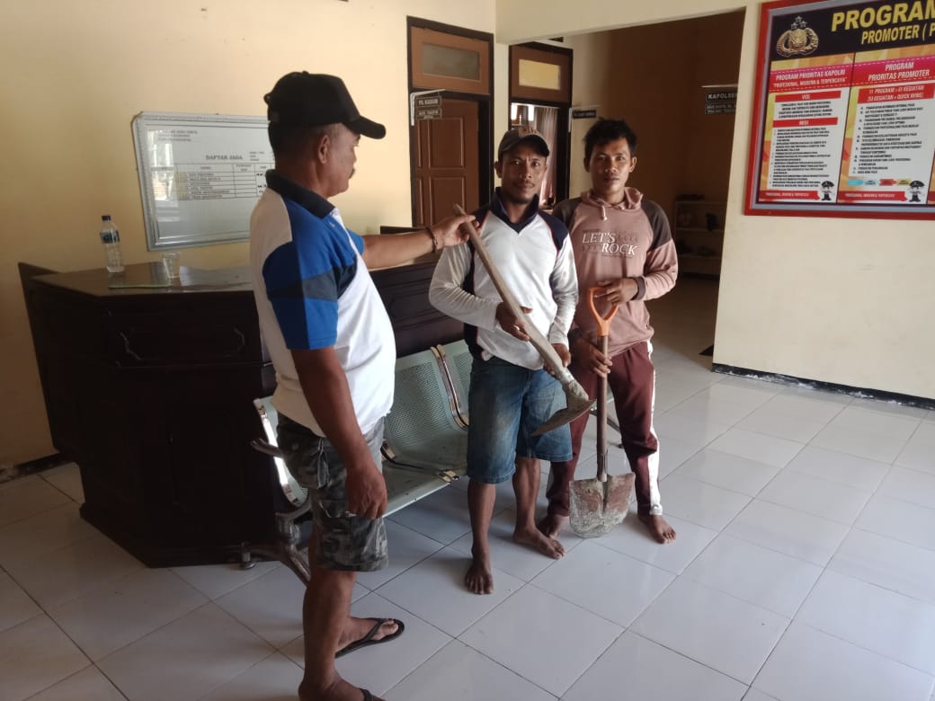 Usai diamankan, ketiganya beserta mobil dan peralatan tambang pasir, seperti cangkul dibawa ke Kantor Polsek Kangayan untuk menjalani pemeriksaan.