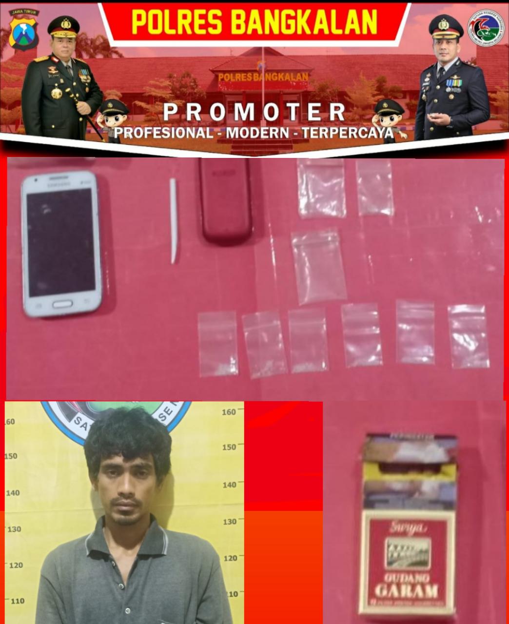 Pelaku tersebut bernama MAHHUR ANWAR (42) asal Desa Banyior, Kecamatan, Sepulu, Bangkalan, dengan barang bukti 13 poket sabu serta 1(satu) lembar tissue, 1 buah pipet kaca, 1 buah bong, 1 buah pipet kaca panjang, 1buah sendok sabu, 1 buah korek api gas warna hijau, 1buah kompor sabu dan uang tunai senilai Rp. 250.000,- hasil penjualan sabu