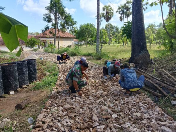 SUMENEP, (Transmadura.com)  – Guna meningkatkan perekonomian masyarakat dan membantu Pemerintah Daerah, Babinsa Koramil 0827/15 Batu Putih Serka Guno Widagdo membantu warga membangun jalan makadam.