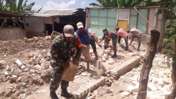Dalam kegiatan tersebut, Babinsa dan warga fokus pada pembersihan batu koral, sisa batu bata, serta puing-puing reruntuhan agar lingkungan sekitar menjadi lebih bersih dan aman.