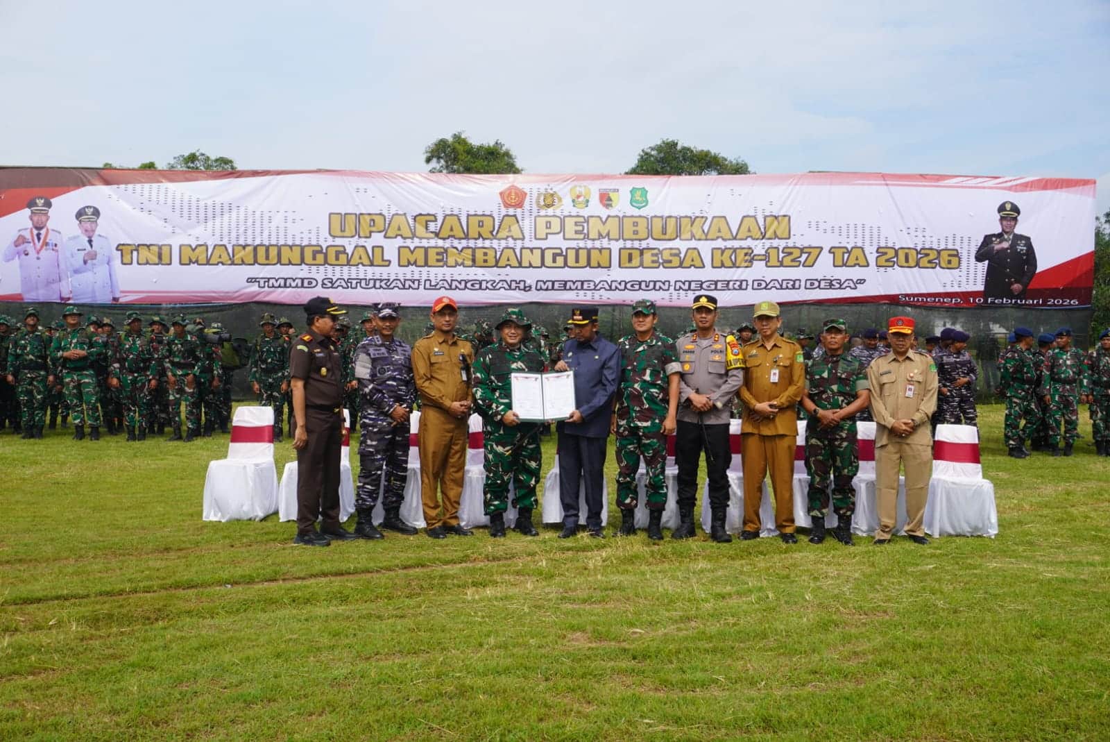 SUMENEP, (TransMadura.com) – Program TNI Manunggal Membangun Desa (TMMD) ke-127 Tahun Anggaran 2026 Kodim 0827/Sumenep resmi dibuka, Selasa (10/2/2026). Upacara pembukaan digelar di Lapangan Sepak Bola SMP Negeri 1 Rubaru, Kabupaten Sumenep, Jawa Timur, dipimpin langsung Bupati Sumenep Achmad Fauzi Wongsojudo.
