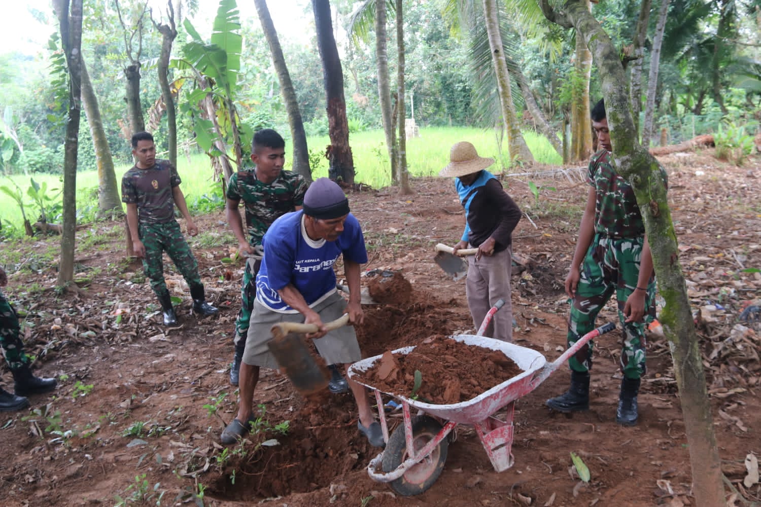 Di lokasi, anggota Satgas TMMD Serda Kelvin terlihat turun langsung mengerjakan penggalian lantai yang belum rata, kemudian melakukan pengurukan dan pemadatan tanah sebagai fondasi sebelum tahap pengkeramikan dimulai.