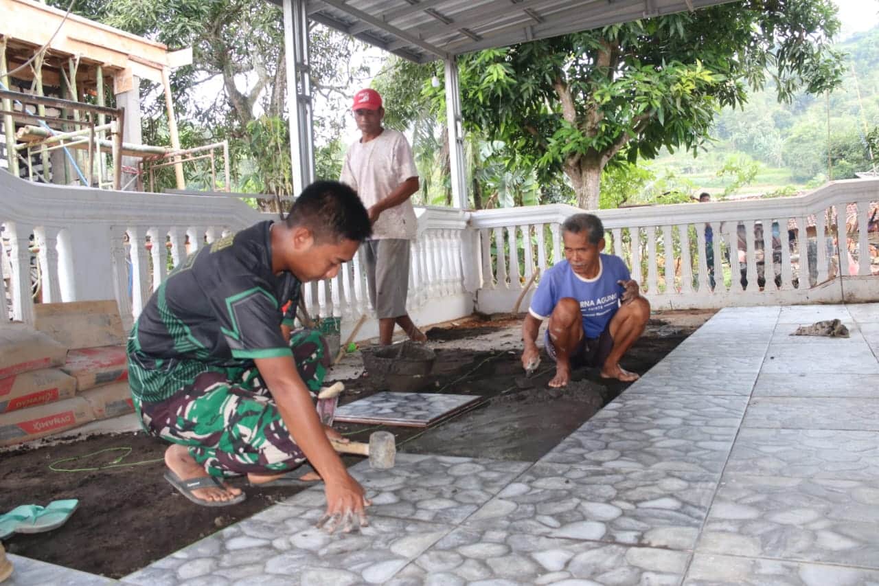 SUMENEP, (TransMadura.com) – Suasana kebersamaan terlihat di Masjid Baiturrahman, Desa Mandala, Kecamatan Rubaru, Kabupaten Sumenep. Anggota Satgas TNI Manunggal Membangun Desa (TMMD) ke-127 Kodim 0827/Sumenep bersama warga bergotong royong memasang keramik di teras masjid tersebut.